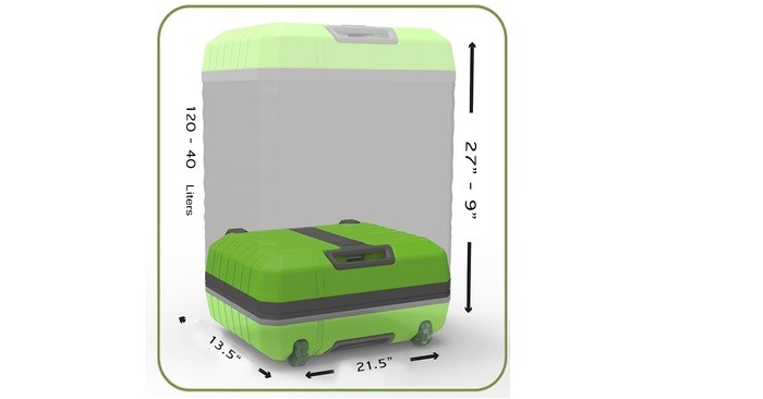 Названный в честь рыбы фугу, Fugu Luggage расширяется от компактного ручного размера до полноразмерного туристического чемодана за счёт своих подобных кожаному зобу той самой опасной рыбы стенок. Чтобы соответствовать максимальному ограничению размера ручной клади, допускаемой авиакомпаниями для перевозки в багажных отсеках пассажирских самолётов, кейс представляет собой ёмкость 21,5 дюйма в ширину (около 55 см), 13.5 дюйма ( около 35 см) глубиной и 9 дюймов (примерно 23 см) в высоту с рабочим объемом 40 литров в “ручном” режиме использования. Для увеличения вместительности этой чудо-сумки имеется возможность увеличить внутреннее пространство до 27 дюймов (около 68 см) в высоту, тем самым доведя объем до внушительных и солидных 120 литров, когда он полностью расширен. Fugu склоняет стрелку весов под собой до отметки 8,8 фунтов ( или же 4 килограммов), что, как говорят сами его создатели, сопоставимо с любым другим багажным чемоданом среднего размера.
